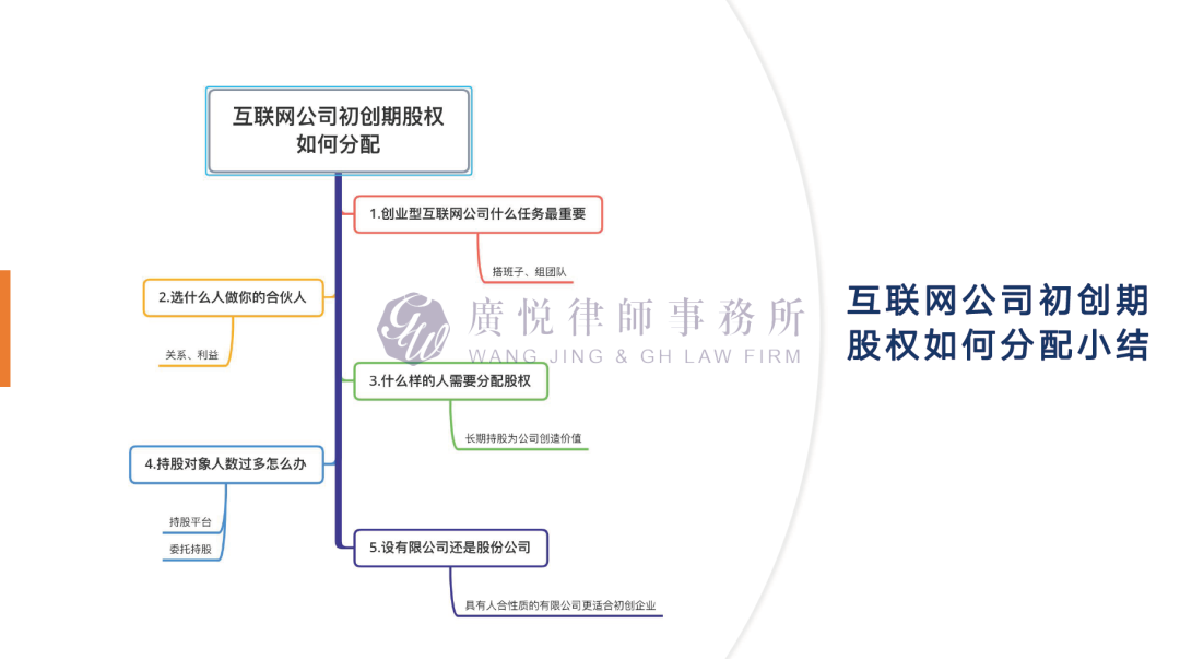 主讲嘉宾广悦律师事务所合伙人冯清清律师,围绕互联网公司初创期股权如何分配、预留和设计员工激励股权架构、通过股权架构吸引投资人、保障股东创始股东控制权的架构设计、实现股权架构层面风险隔离五大方面进行深入讲解。