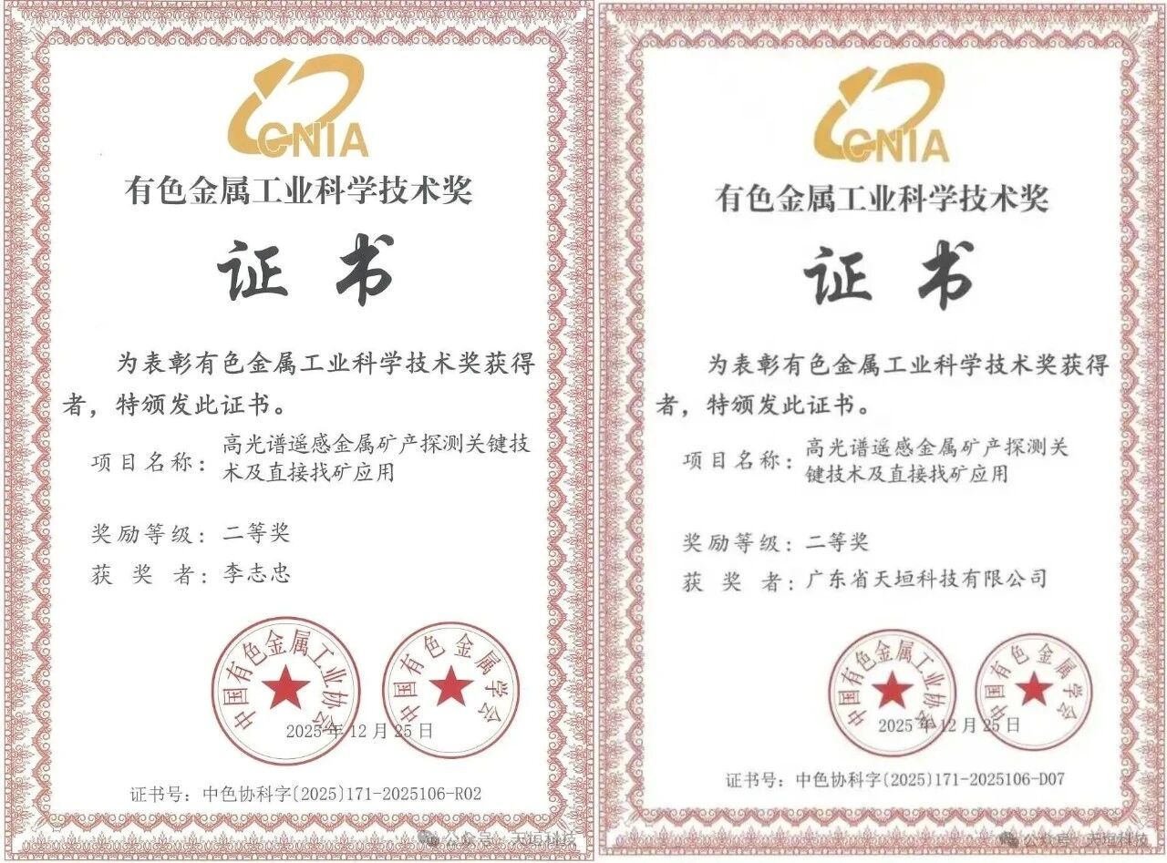 天垣科技近日迎来双重突破:在技术创新层面,由李志忠院士牵头攻关的高光谱遥感金属矿产探测关键技术及直接找矿应用项目,荣获有色金属工业