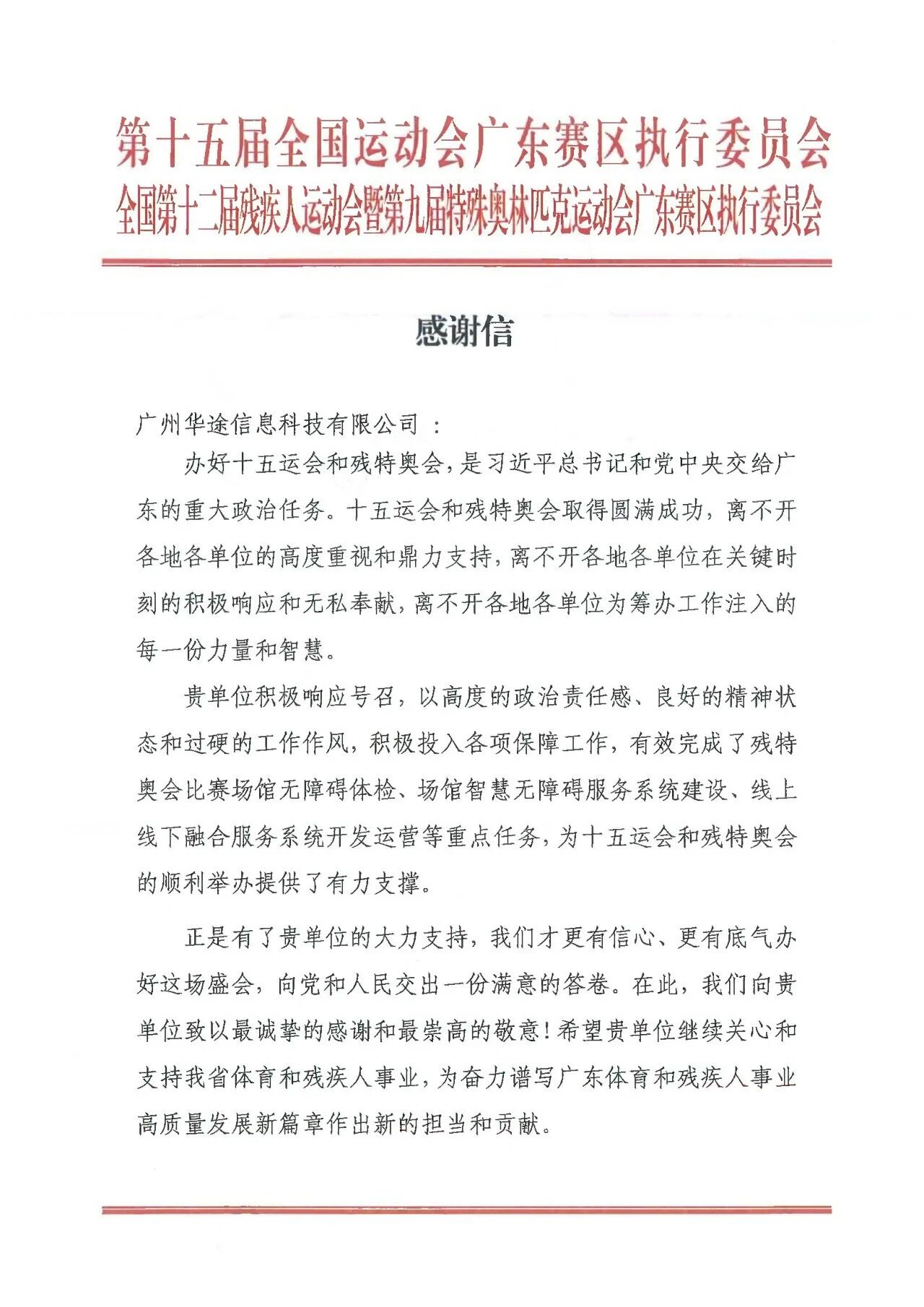 近日,华途科技接连收到来自第十五届全国运动会广东赛区执委会、全国第十二届残疾人运动会暨第九届特殊奥林匹克运动会广东赛区执委会等多部