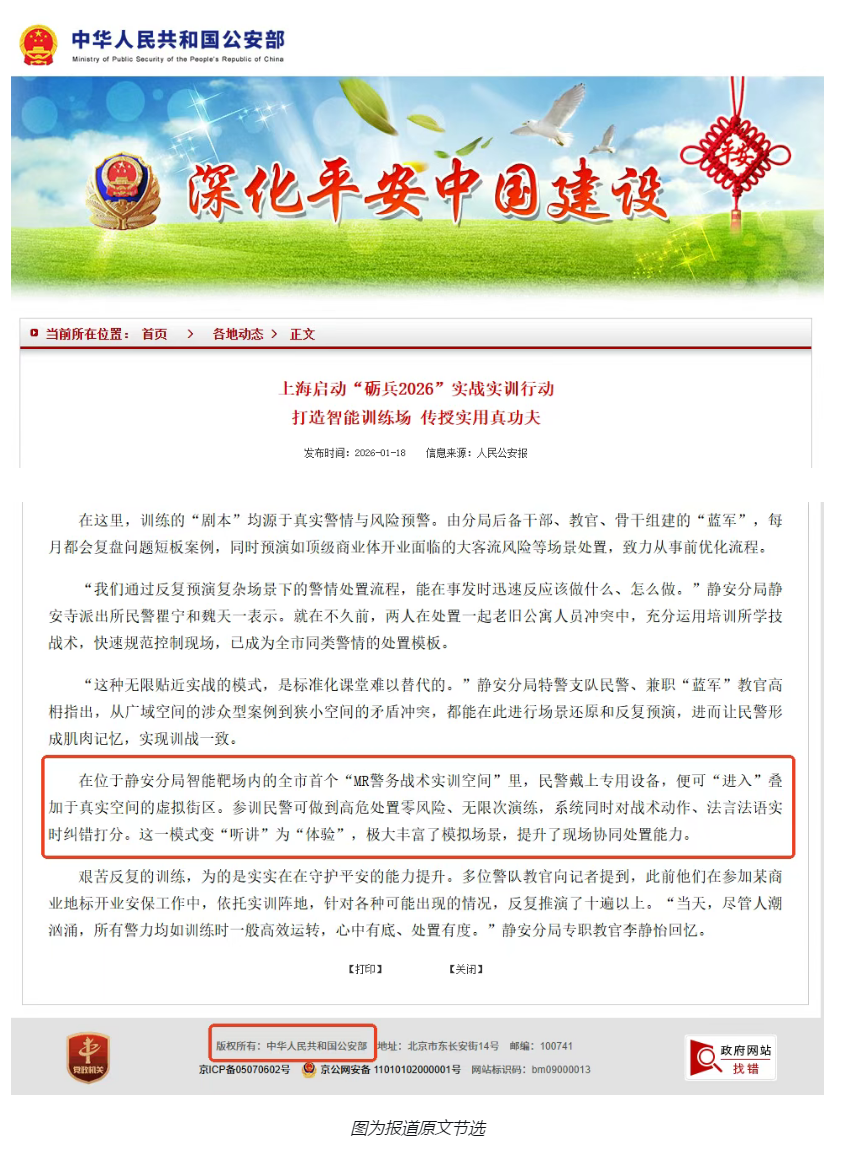 1月18日,公安部官网在《上海启动砺兵2026实战实训行动》报道中指出,上海市公安局静安分局在智能靶场内建成了全市首个MR警务战术实训空间